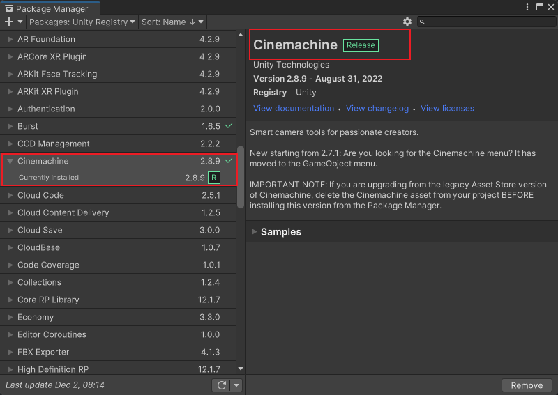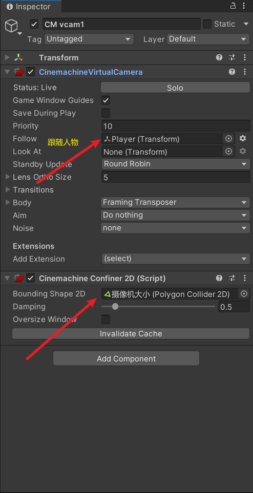 一般会在主相机中添加一个CinemachineBrain 并创建一个 CM vcam1 相机