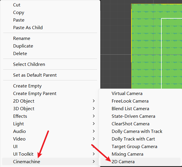 2.创建一个相机: 场景内右键后选择: Cinemachine